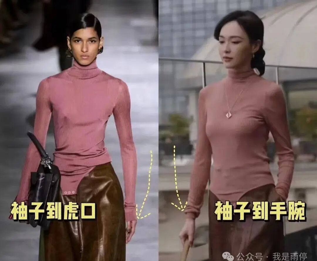 说到袖口,这件衣服连超模穿袖子都显得有点长。超模就让袖口自然掉到虎口那儿,手腕那儿就堆了点褶子。唐嫣呢,直接把袖口整个扯到手腕上,结果袖子在那儿就堆起来了。