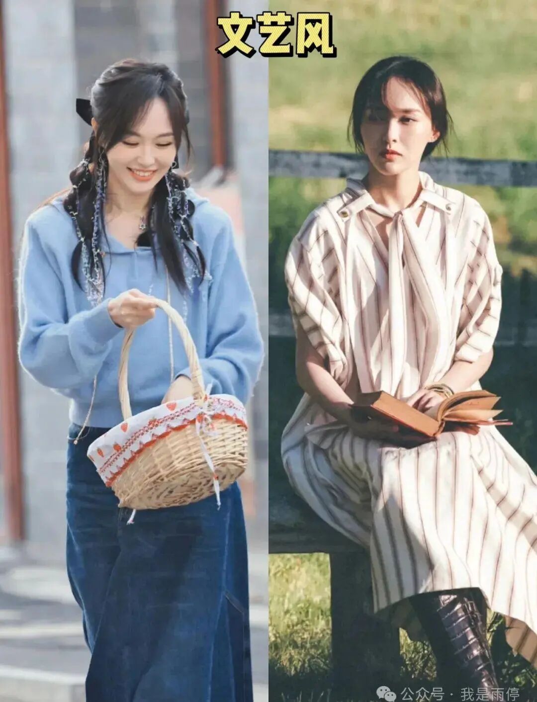左边这套走的是温馨文艺范儿,淡蓝毛衣加深蓝牛仔裙,看着就清新舒服,半扎公主发更添柔美,手上的花篮特有田园味;右边那套则是清冷文艺风,竖条纹宽松连衣裙配上皮靴,低马尾一扎,手里拿本书翻着,眼神望向远方,整个感觉超有氛围,就像电影里的女作家似的。