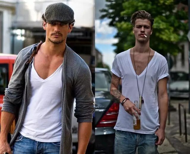 说完身材再来看看衣服的款式哪些是要不得的。首先V领就不是很好穿,而深V就更不要提了。为了凉快你们可以穿背心,或者哪怕不穿都比穿深V要好。不要幻想谁都是大卫·甘迪。