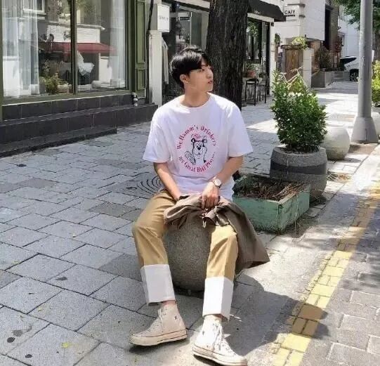 狗头图案的T恤完全让男生的气质变得可爱跟邻家,再选择一条卡其色的拼接休闲裤,搭配一双高邦的帆布鞋,完全的青春感,甚至有几分‘小奶狗’男的呆萌气质,很值得这一类风格的男生选择。