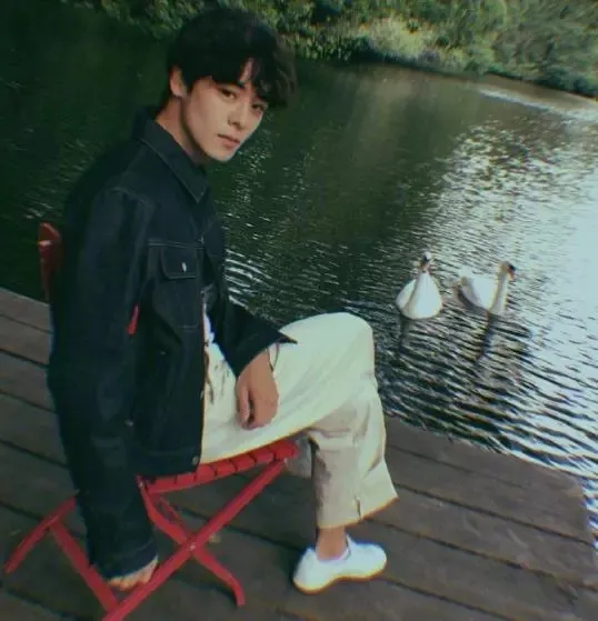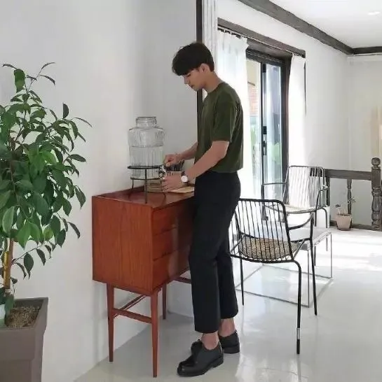 纯色的圆领T恤搭配的是黑色的高腰七分休闲裤,本来是很常见的搭配,但是因为颜色的选择而使其气质变得更加的突出,个性化也十分的明显,非常带给人一种邻家大哥哥的气质。