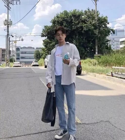 内搭是黑色的圆领T恤,外搭则是白色的翻领衬衣,下身选择的是破洞直筒修身牛仔裤。这款搭配尤其的凸显青春感和朝气感,而且特别的显得男生腿长。非常阳光清新的搭配,是一款不用看脸就能彰显气质的搭配。