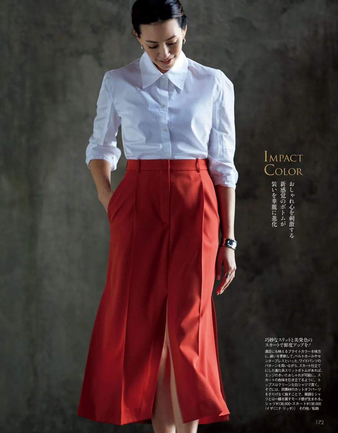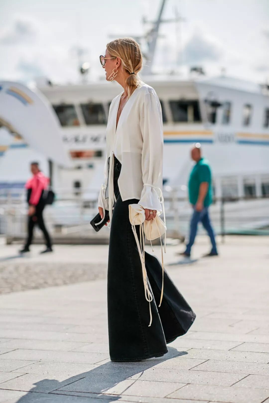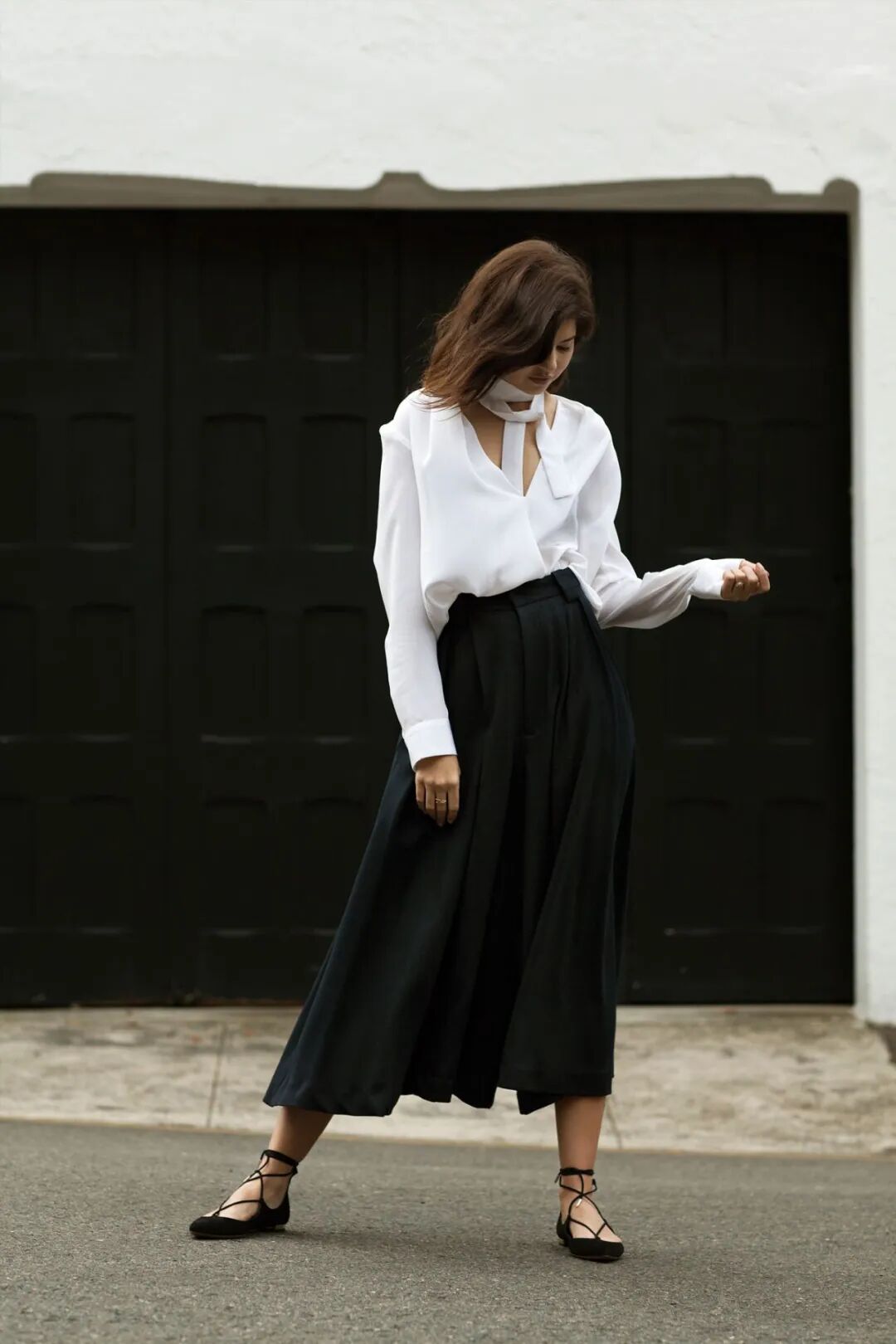白色衬衫+黑色半裙,彰显出神秘优雅的美。把下角塞进去不仅可以显瘦、显腰身,还能让你的整身造型看起来更有层次感。