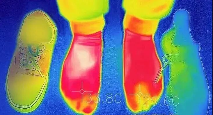 可以发现,同样运动10分钟后,穿上飞织鞋的那只脚,脚部温度比另一只低了4.2度!