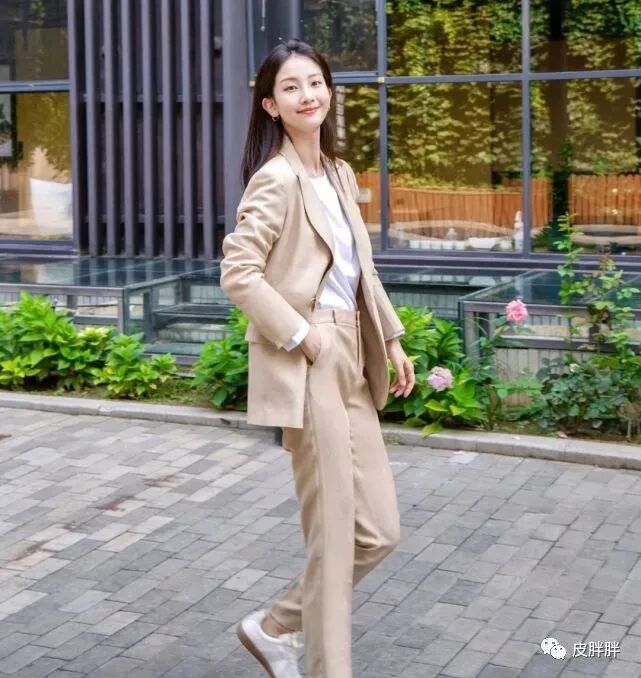 但如果想要把西装穿出休闲感,可以在穿搭细节上做点“手脚”,就像这位时尚博主一样,她选择了以浅色为主的西装搭配很简约的白色打底衫,穿在身上就比较舒适,还穿出了休闲的视觉效果,尤其是配上小白鞋之后,更加突出了休闲感。