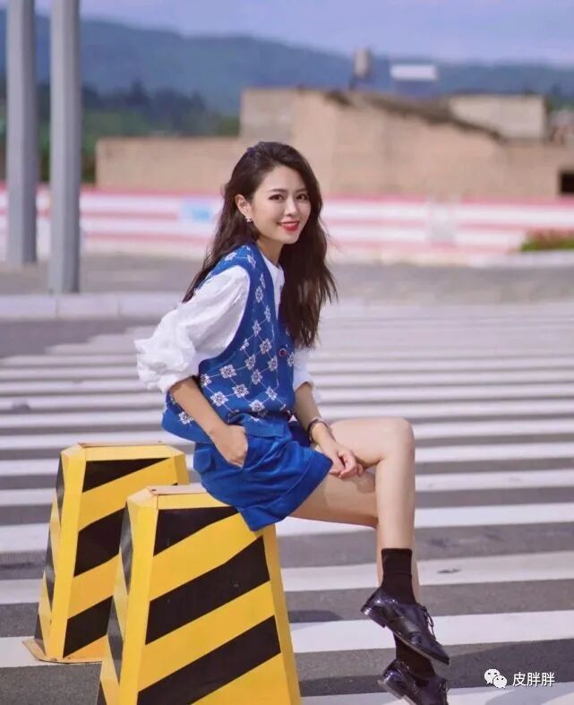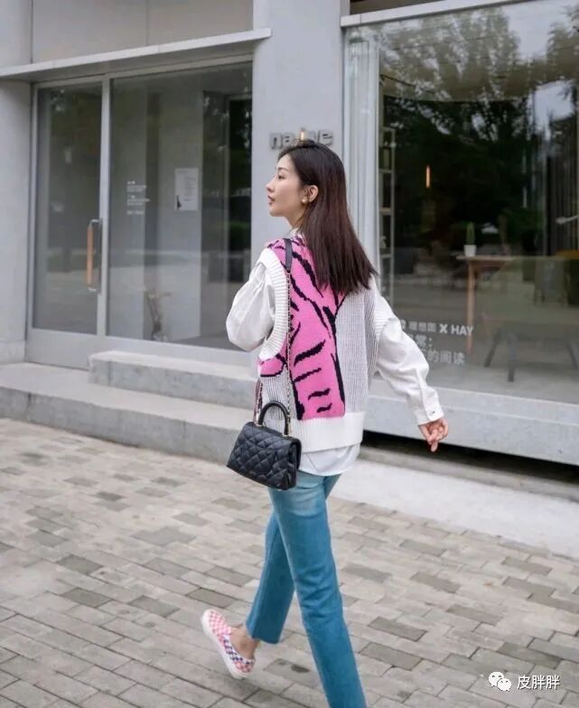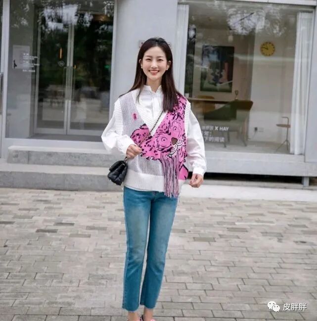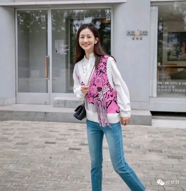 这位时尚博主选择了一件无袖设计的针织衫叠穿白色衬衫,在配色方面是以白色为主,整体穿搭造型就显得很清爽,还穿出了很清纯的美感,两件衣服叠穿在一起之后,就显得很有层次感。