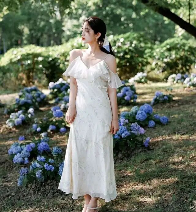在穿颜色比较浅淡、花色比较干净,同时材质也偏向飘感的裙子的时候,点缀的配饰风格也应该偏向柔和感。借鉴图上的用丝带作为发带点缀于发梢,这种不经意的点缀却能制造非常亲切的女神气息,无意间释放的女人味最有感觉。