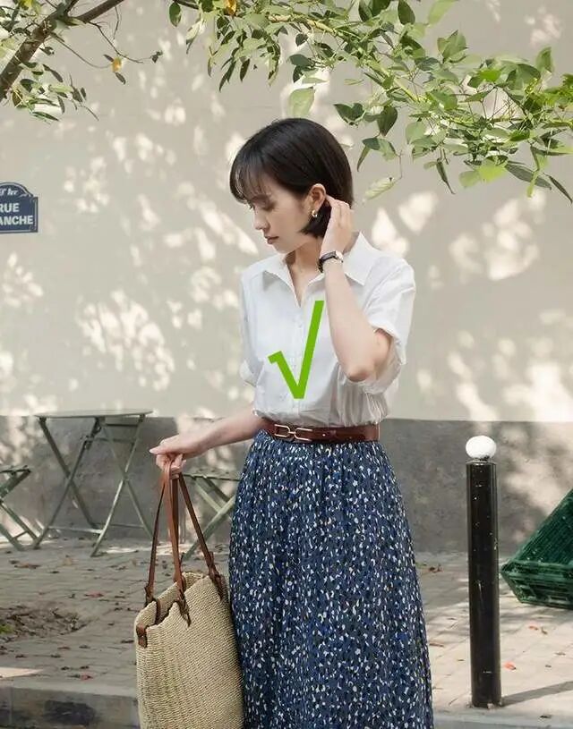 半身裙的精髓在于它的腰线够高和长度够长,特别是搭配短款的上衣时会更显灵魂,因为打造的就是肉眼可见的高挑感。所以如果想让自身的比例看起来更佳,一定要选择偏短的上衣去搭配比较长的半身裙。