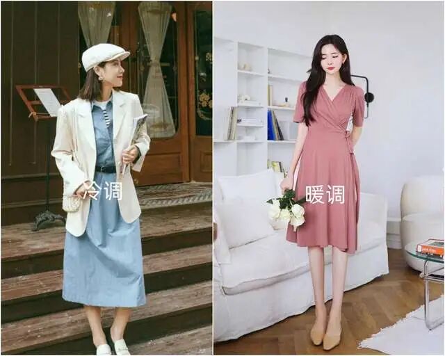 后者仔细看属于冷暖色的反差结合。暖色上衣与冷色半裙的结合就是借用了两种相反色调的区别去打造辨识度,既有暖色的红润感,又有冷色衬托下的白皙感,很出片。