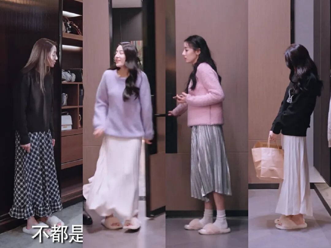 除了以上六套穿搭,乔晶晶日常居家穿搭也是又甜又美,居家除了穿一整套的居家服之外,她有很多毛衣+半裙的组合,可见她确实是个精致女性,已经把穿衣搭配融入日常。