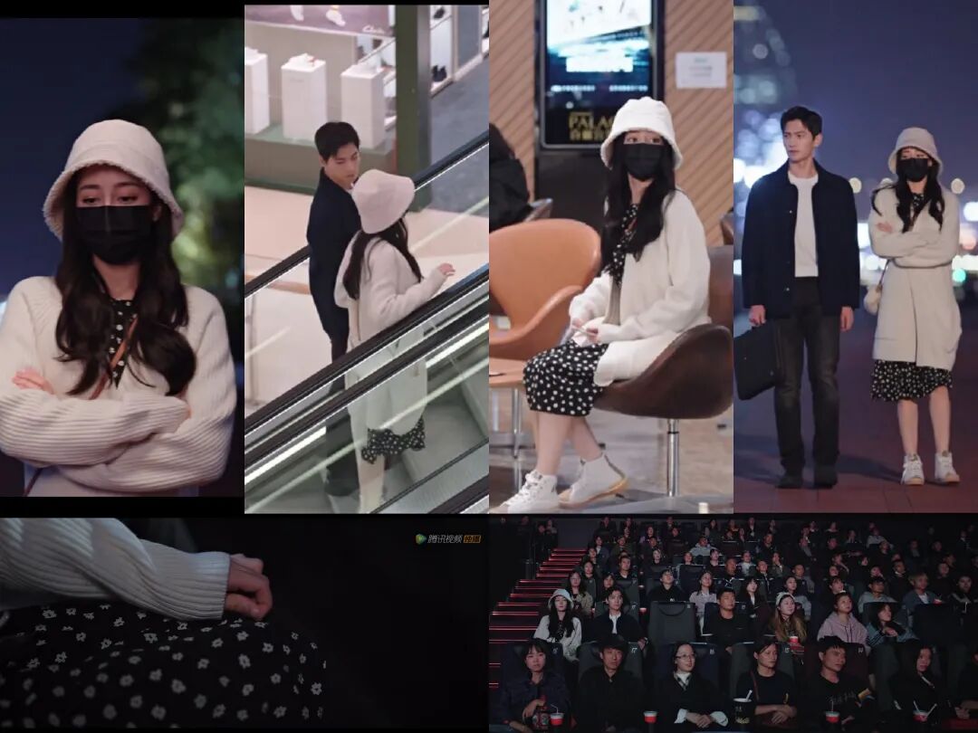 Look2乔晶晶在剧中是个大明星,出门最怕被狗仔拍,光棍节当天,乔晶晶和于途两人谍战式去看了场电影,乔晶晶穿黑白碎花连衣裙+白色毛衣开衫+白色渔夫帽+白色小短靴,一身无彩色搭配看似低调,小碎花的元素又增加几分精致,人群中即使裹得严实,明星气质掩盖不住。
