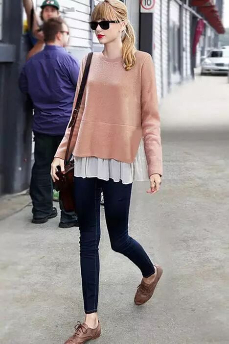 很好看的假两件,不用刻意去搭配,一件搞定,上身效果超级棒,也是百搭单品哦,果断自留款,不管是单穿还是打底都非常的好看的哦!随意搭配短裤短裙和小脚裤就可以美美的出门了!衣服是藏青色的哦,学院风的颜色很棒!