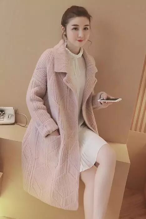 优质柔软的针织棉混纺面料,有弹性,无内衬,厚度适中。时尚大翻领设计,长袖,很洋气的哦~前身帅气无扣开襟,两口袋装饰,长款,衣身菱格纹针织勾勒,中长款宽松版型,瘦子胖子都可以穿得美美哒