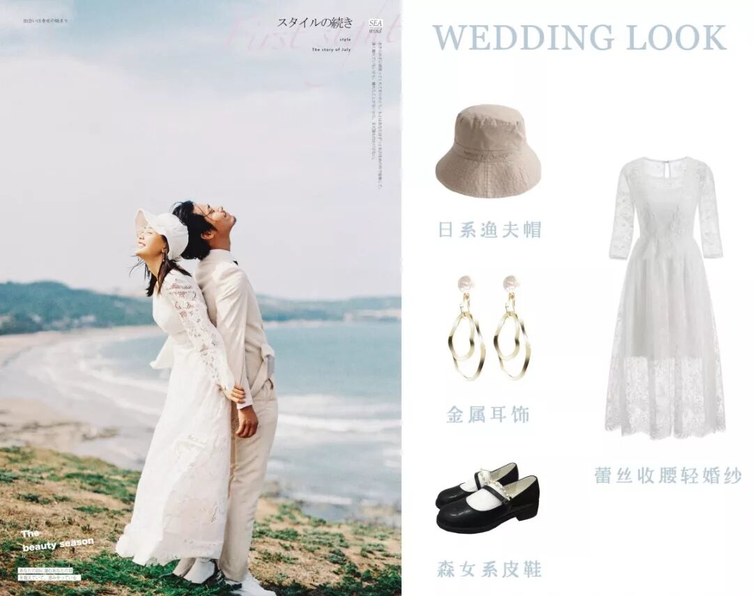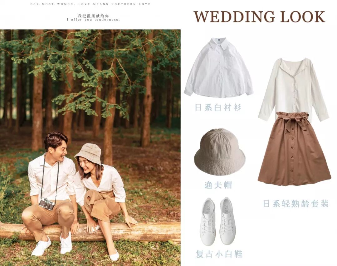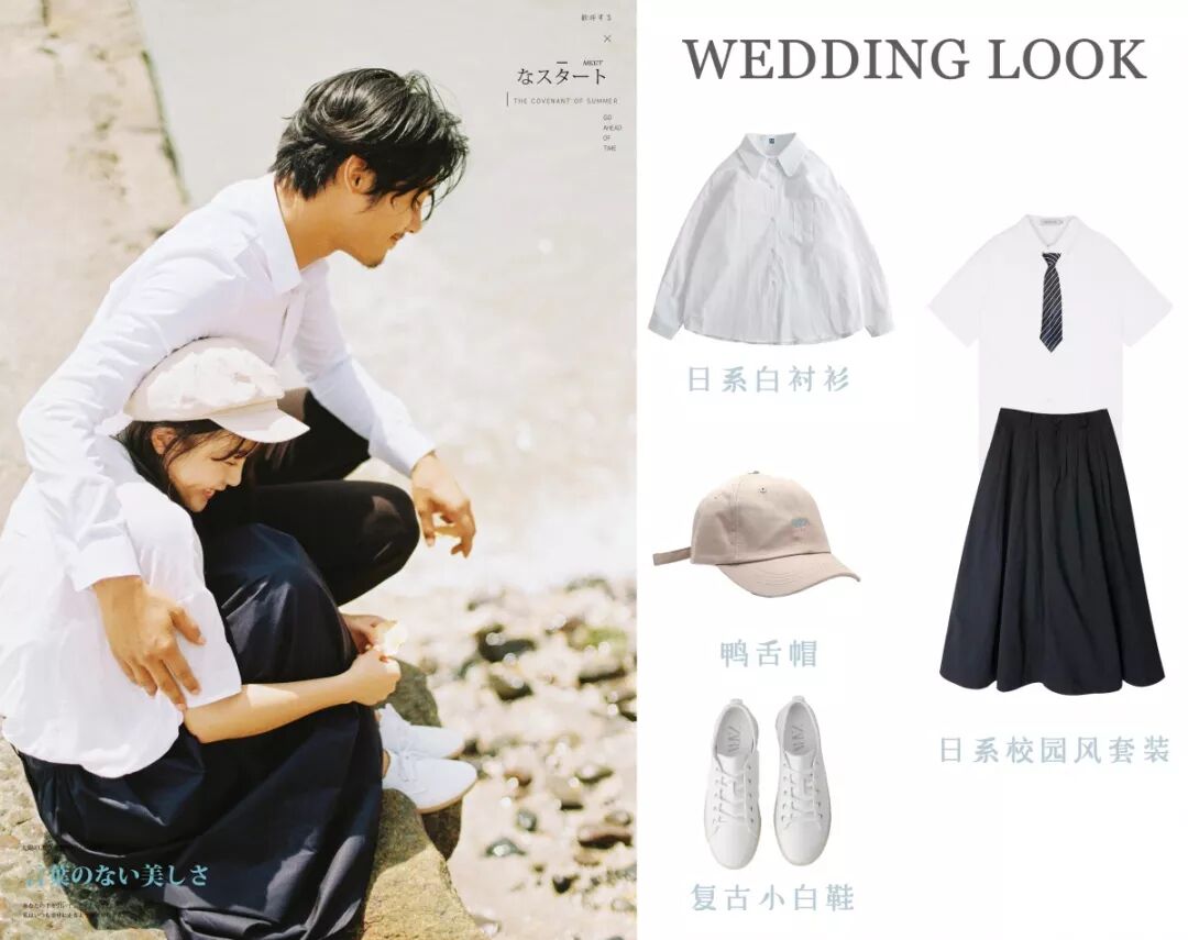 渔夫帽跟小白鞋是减龄必备的单品,很多人觉得婚纱照就是必须是白纱裙、高跟鞋,当然不是啦~如果你想拍摄日系的婚纱照,那就把高跟鞋换成小白鞋或者小皮鞋,再把婚纱照换成白衬衫吧~