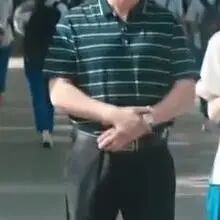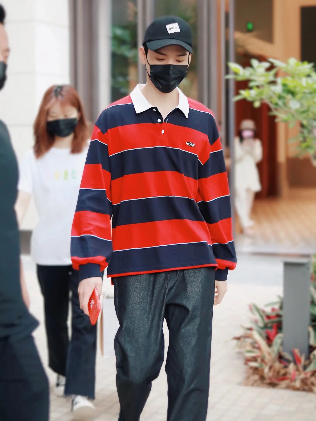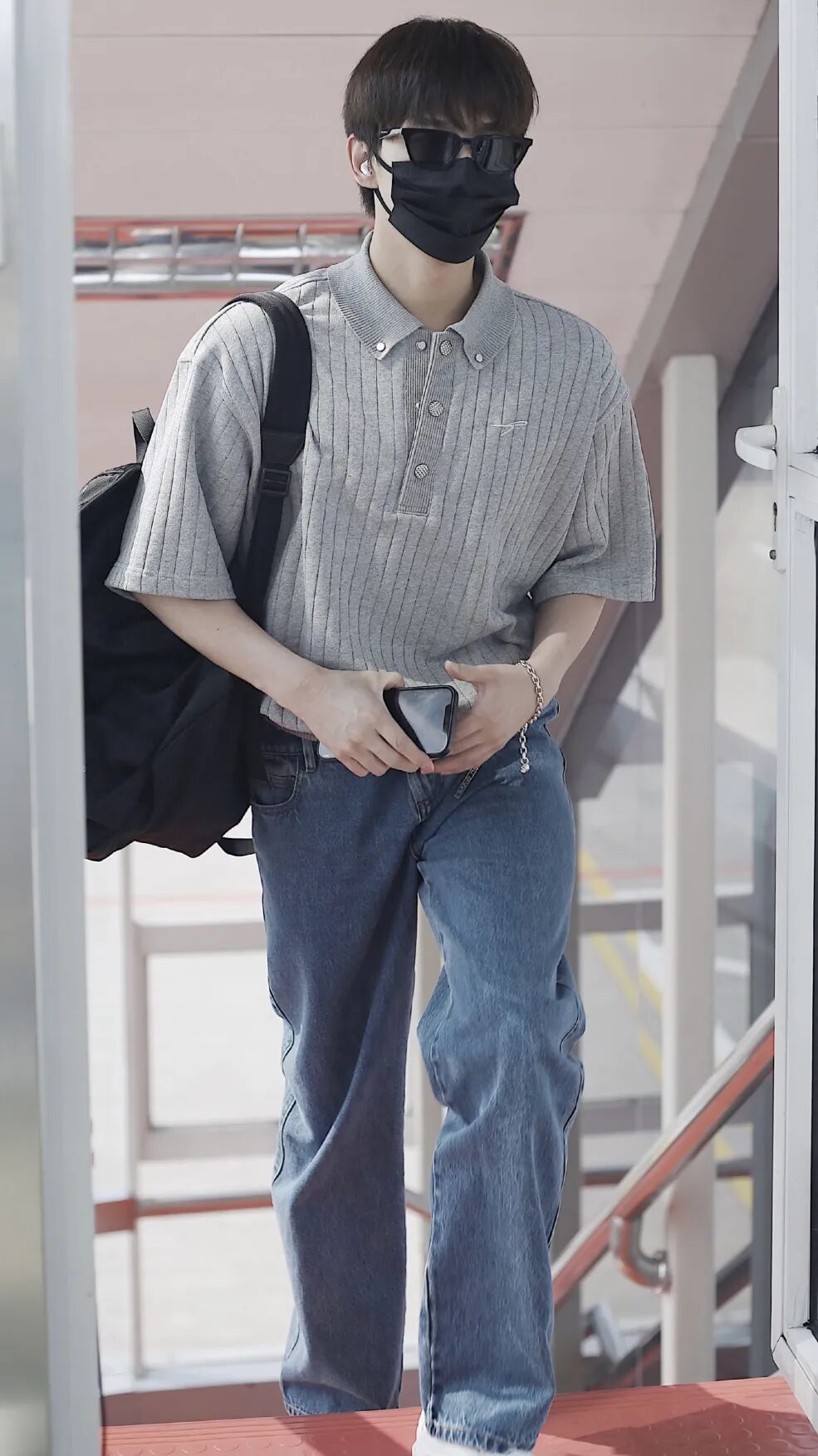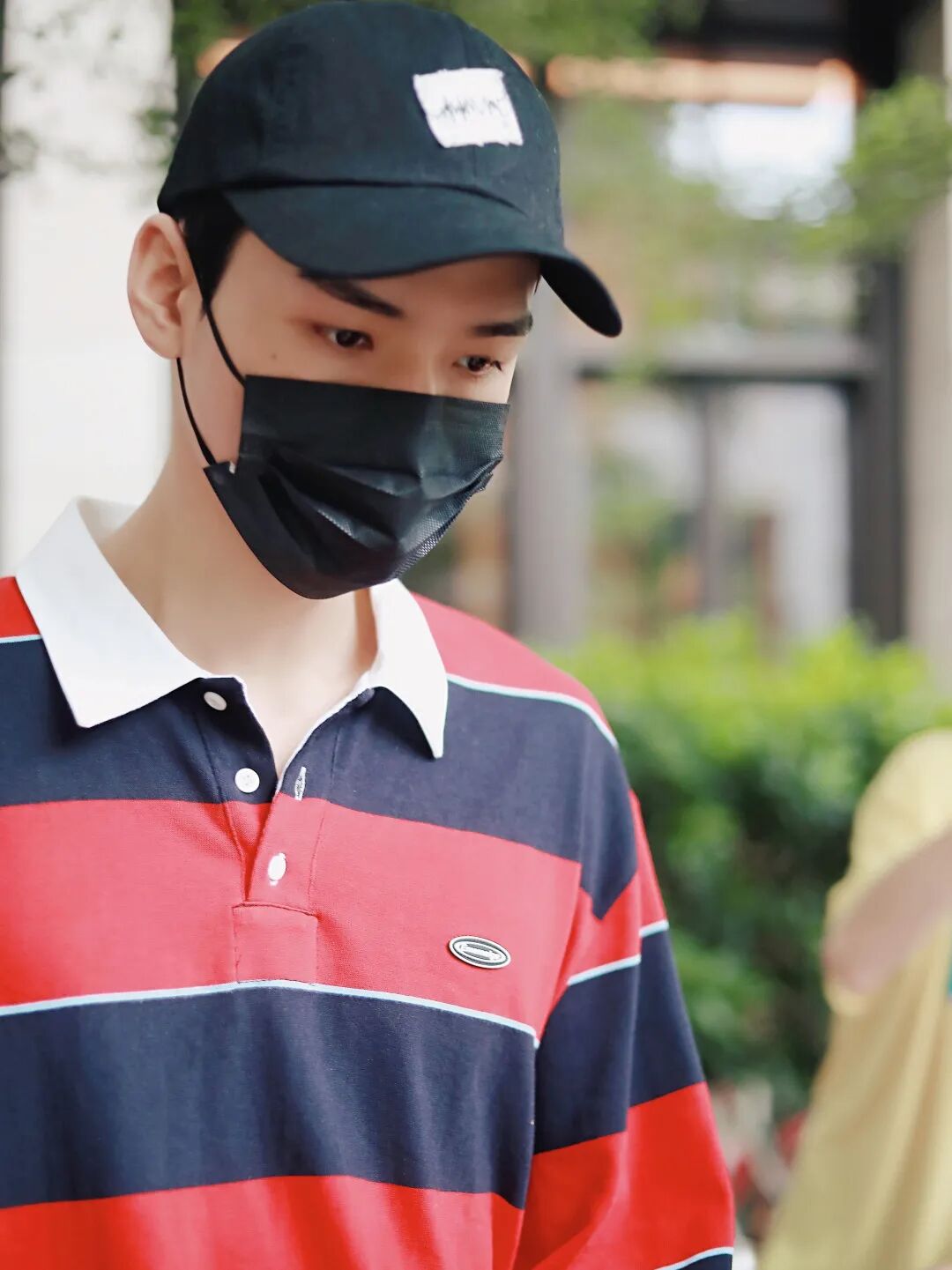 上身浅灰色竖纹针织Polo衫,下身牛仔裤,少年感爆棚。?一戴,气场全开,"军艺校草"帅拉惹~