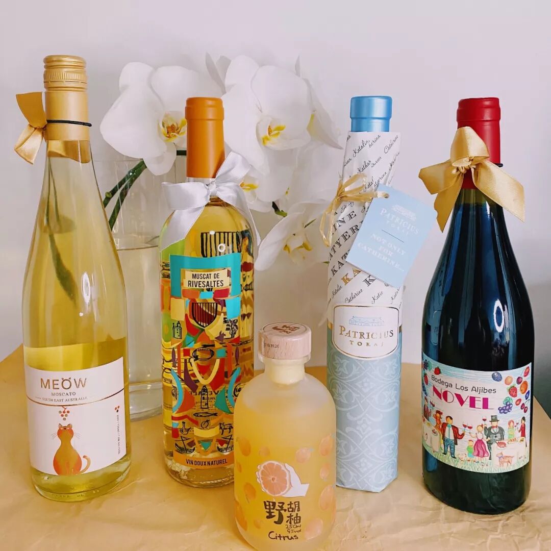后排从左至右:MEOW澳洲莫斯卡托白猫甜白葡萄酒少女起泡酒、有爱之岛南法天然甜、蓝风铃托卡依白葡萄酒、祝幸 西班牙金奖红葡萄酒、 | 前排: 野胡柚柚子酒
