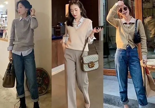 如果你有件很普通的毛衣,那么在里面叠穿一件帅气的衬衫,立马就变得时髦起来了,在配色时,最简单的方法就是选择同色系或相邻色系进行搭配,会显得和谐而高级。驼色毛衣开衫叠穿米驼色衬衫,同色系搭配起来很有质感,下装搭配简约的牛仔裤,整套搭配下来,给人的感觉是轻松而洋气的,很有都市感。米驼色无袖毛衣叠穿米色衬衫,配色优雅而温柔,搭配同色系的阔腿裤,显高显瘦,而且很有气质。毛衣+西装裤