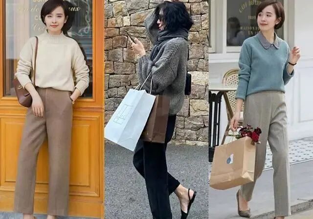 对于上班族们,我们不妨选择基础款毛衣与西装裤进行搭配,得体端庄,选择经典色或莫兰迪色,看起来既高级又很有知性气质。雾霾蓝色毛衣搭配灰色衬衫与暖灰色毛呢西裤,同属于莫兰迪色系,带着灰调,低调而高雅,整套搭配下来,满满的高级感,非常适合通勤。灰色宽松版毛衣搭配黑色西裤,配色经典,自带高级范儿,又显得慵懒而随性,逛街聚会时穿,很吸睛。毛衣+百褶裙
