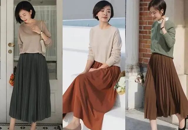 想要穿出优雅女人味,我们可以尝试下毛衣搭配百褶裙。百褶裙属于伞裙,束腰宽裙摆的设计,可以穿出好看的身材曲线,搭配稍稍修身一些的毛衣,非常温柔的感觉。雅致的米色毛衣搭配焦糖色百褶裙,配色非常温柔知性,带着清甜的味道,很迷人,这样穿也非常显肤色白皙,减龄效果不错。暖灰色毛衣搭配深灰色百褶裙,配色优雅沉稳,适合成熟一些的女生,低调却显得蛮高级的。毛衣+针织半裙