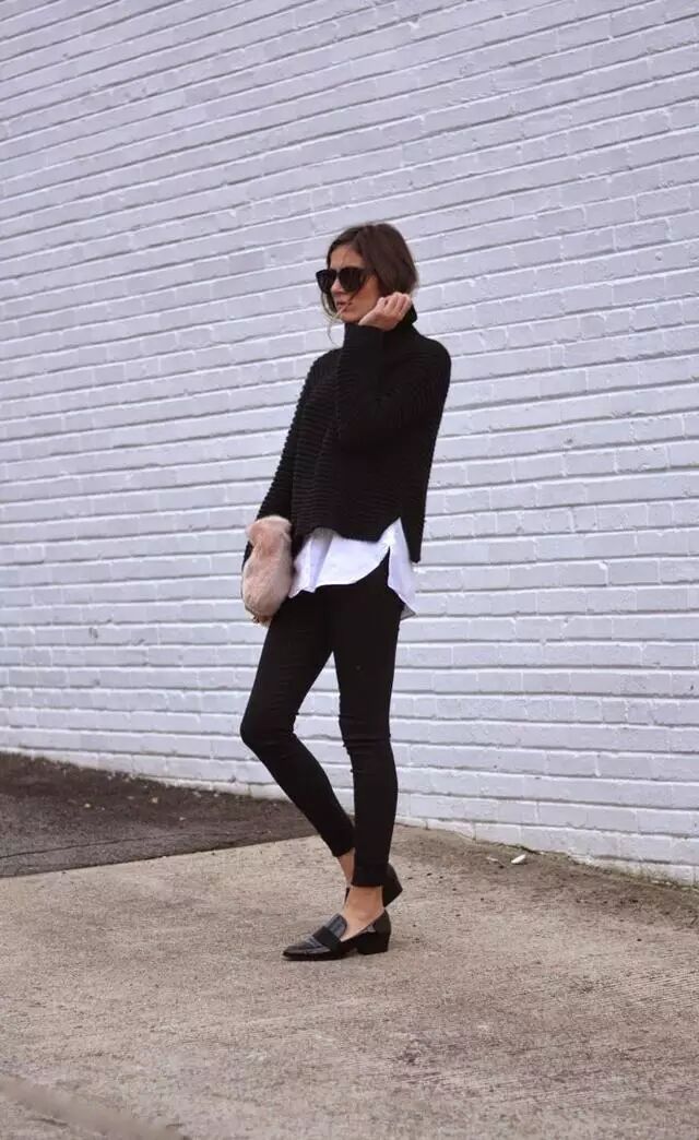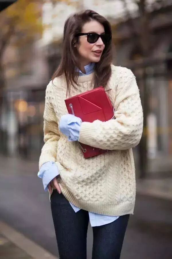 袖口完全不露出衬衫的情况其实并不推荐,因为这样看起来很容易忽略衬衫和毛衣搭配起来的层次感,除非你是颜值高脸蛋美身材姣好的模特,不然旁人看起来就是毛衣买大了尺寸而已。