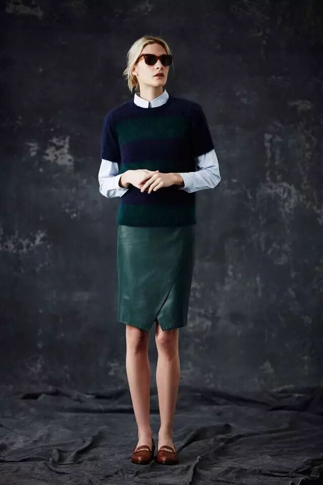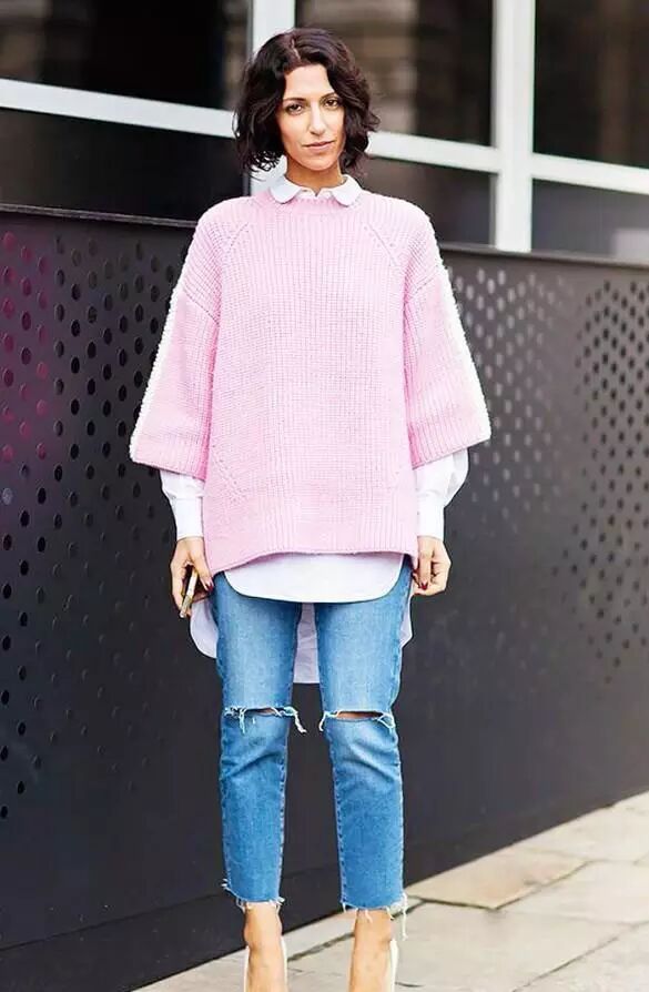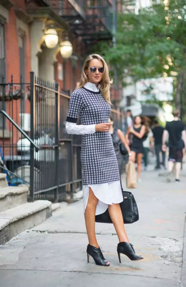 衬衫的下摆如果比毛衣长出太多的话,会感觉也是怪怪的,好像是生拉硬拽的两个单品拼合在了一起,尤其是紧身毛衣把宽松的衬衫裙箍在身上,特别的违和,对于身材比例不甚理想的人,也较能塑造出“上身长,下身短”5:5比例。