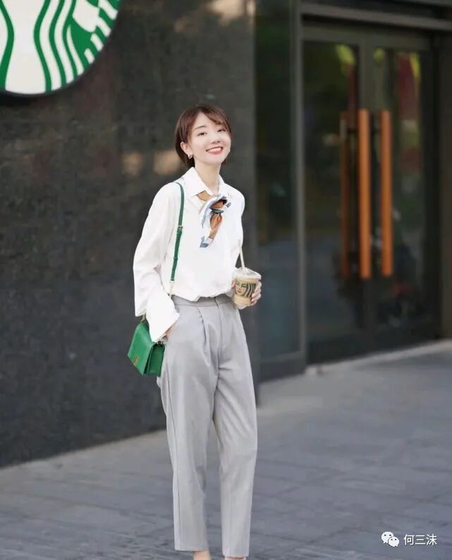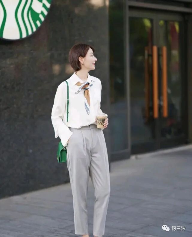 但为了把常规的白衬衫穿出高级感,一定要把下摆处理好,如果觉得太过单调的话,还可以选择合适的丝巾来点缀,会让整体穿搭造型更精致。