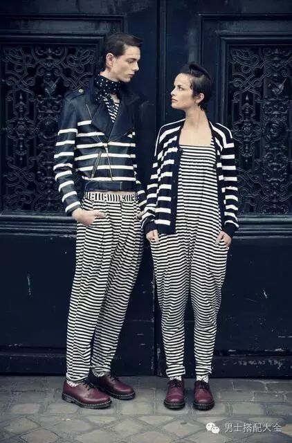 如果觉得全身一样太无聊又没创意,可以试试上下身元素交错的概念!让其中一方上身的元素和另一方下身的元素呼应,是一种非常高超的技巧!有创意又有炫耀到!