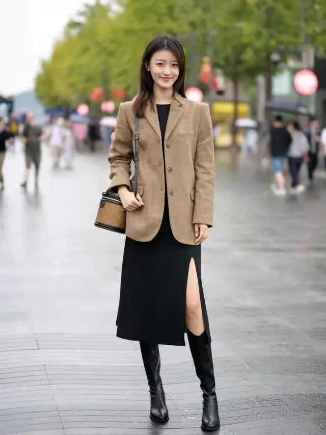 对于很多街头时尚美女来讲,在进行搭配时,一定会选择西装和开叉裙的搭配,刚刚好能够露出一部分的肌肤,并且裙子的长度能够愉悦,靴子相结合,很有街头时尚范儿,打造出温柔小姐姐的气息,利用了非常简单的颜色,便塑造出了高级感暗浓浓的造型。