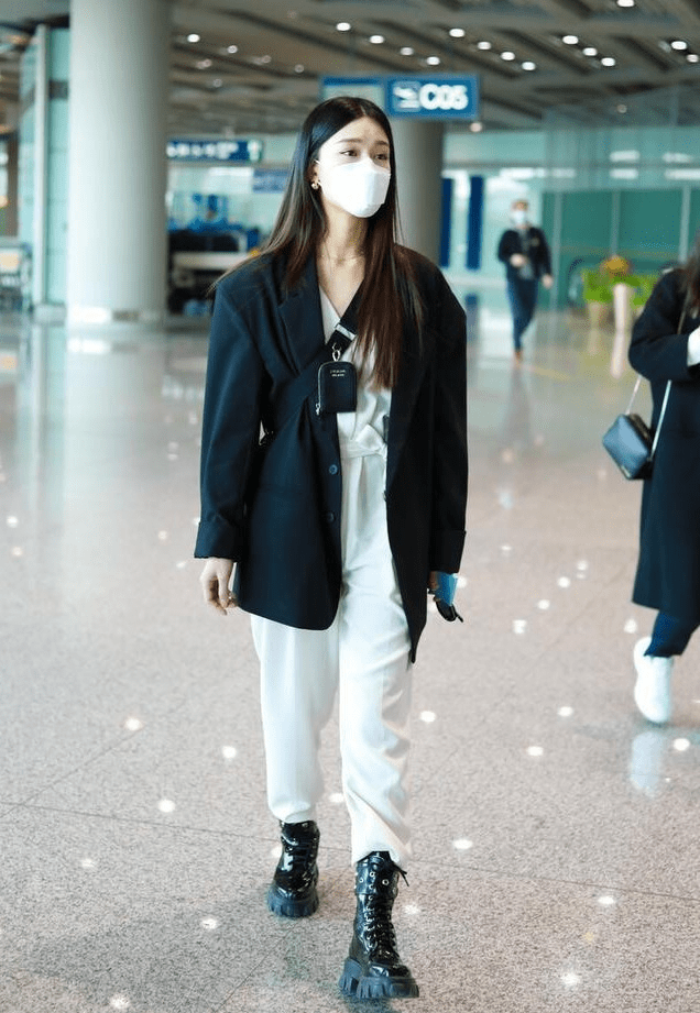 比如黑色的收腰西装,所搭配的牛仔裤偏向于深蓝色,所以很有层次感。一双白色的靴子,让整体的造型都有提亮的效果,全身上下有一种干练的气质,还有利落感,完全get到了高腰线的作用,帅气有型又彰显魅力。