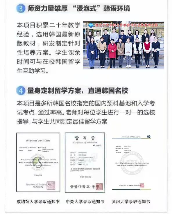 二十年韩语教学经验、分段培养模式,从基础强化、应试技巧到语言能力提升,使同学轻松掌握韩语。一对一升学方案定制、材料准备、模拟面试、入学申请、流程跟踪,与多所韩国大学合作实施预录取,保录取,双录取等模式,为优秀学子入围世界名校保驾护航。