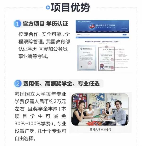 可以高中(中专)直接升本科,专升本,本升硕。专业任选,录取保障,国家承认学历。高额奖学金,费用低廉。韩国国立大学每年学费约2万元人民币,课余时间可合法打工,连续20年签证率100%。