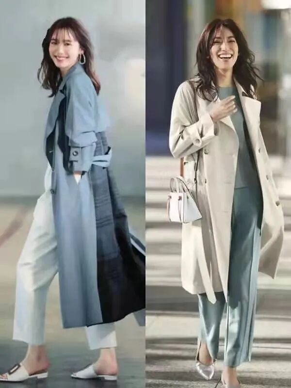 相比于西裤的优雅干练,半身裙更加温柔和大气,也更能够隐藏腿型问题。很适合一些腿粗或梨形身材的人,当然也要记住,虽然风衣的款式一般比较宽松,但内搭也最好能够选择基础修身款,避免过于宽松的单品作为风衣的内搭。
