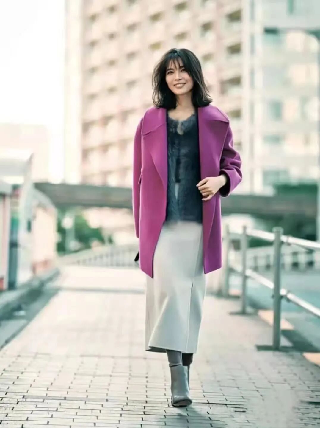 半身裙是最近几年突然流行起来的单品,相比于连衣裙,半身裙的可搭配方式更多一些,适合的人群也更广泛。相比于饱和度比较高的颜色,灰色等百搭色作为半身裙的配色,可以选择的搭配可能会更多一些。但是撞色依旧是时尚的秘诀,灰色打底搭配紫色外套,高级又独特,撞色搭配的原则其实很简单——避免对比色同时出现在身上,就不会出太大的穿搭错误。