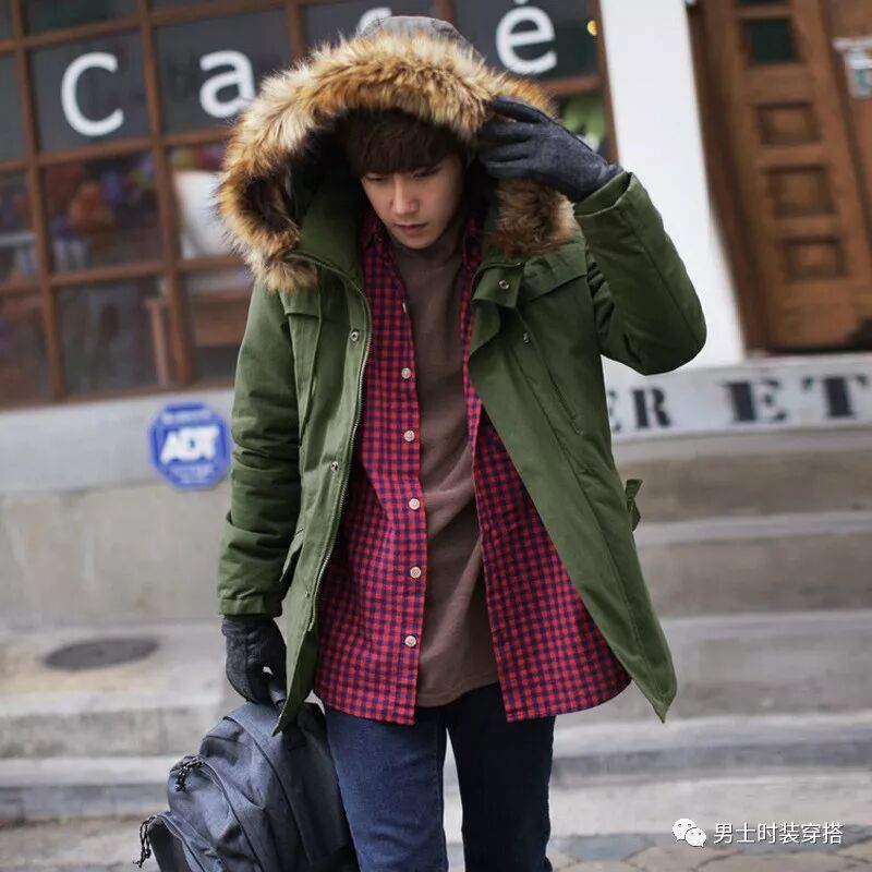 这是这个冬季很流行的服装风格,冬季的男装很流行选用带毛里的兜帽棉服,让人感觉很冬天、很暖和。其实穿着这种兜帽棉服的时候,几乎不会把帽子带上(除非西伯利亚的寒风刮的太猛),更多的是起到装饰作用。