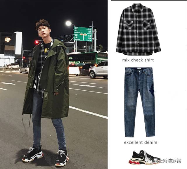 男士冬装中长款带帽棉服,内搭红黑色格子圆领毛衣,搭配牛仔裤,稍微卷起裤腿,穿双英伦风单鞋,彰显暖男气质就这么简单。