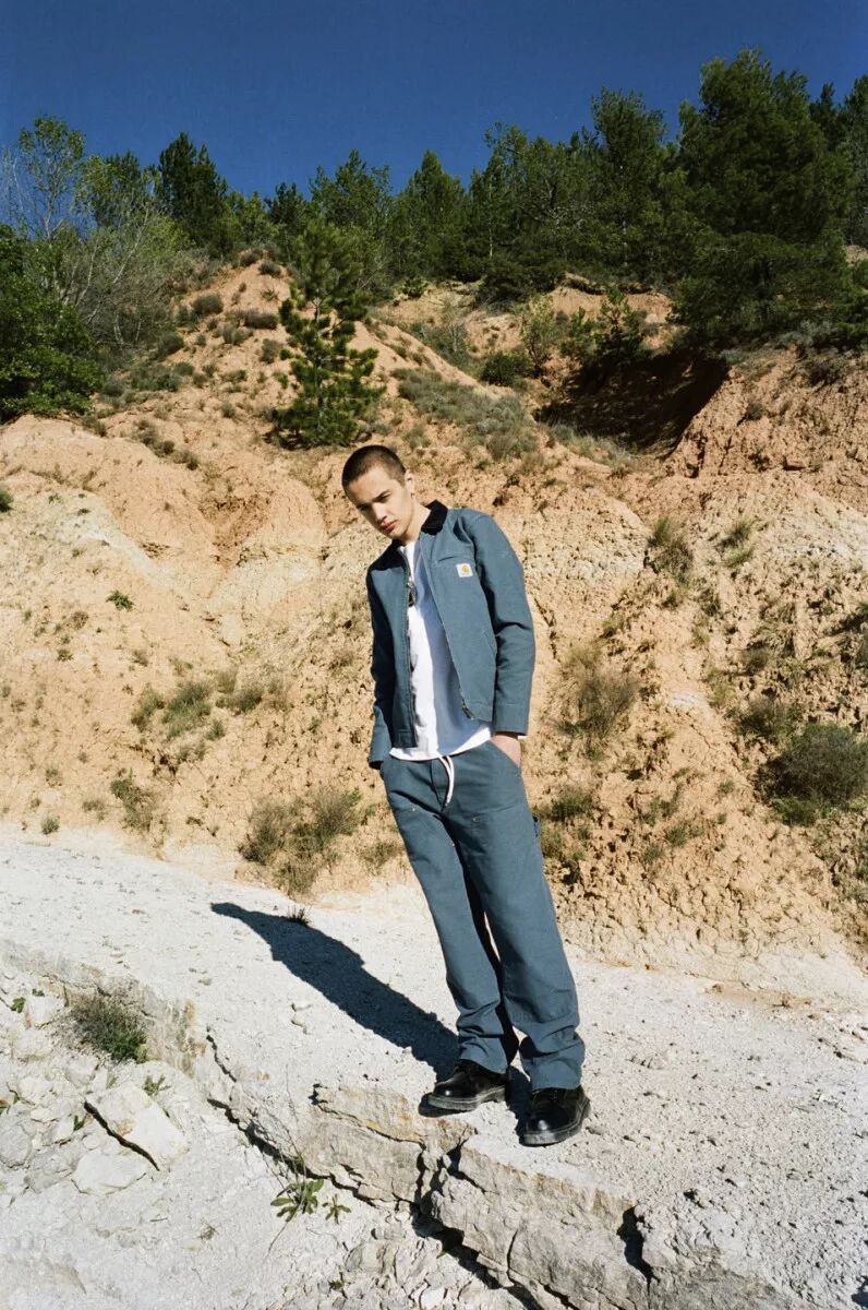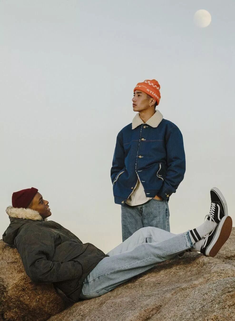 因为工装夹克的颜色多以深色系为主,最普遍的就是搭配深色工装裤。因为工装裤的裤管都是比较肥大型,那么在鞋子的选择上也要尤其慎重,比较大的球鞋会呈现臃肿的既视感,轻盈的帆布鞋、板鞋确才是不二选择。
