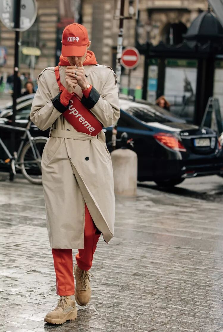 理由很简单,因为这件卫衣本身的设计很特别,带有两顶红白色的帽子,正面也做了红底白logo的设计。再给它搭配上白色马甲,张收有度,不仅能在视觉上形成一定的冲击力,也可以把街头运动风演绎出别样效果。