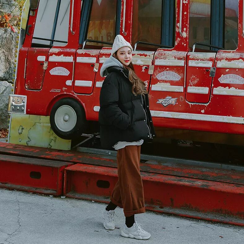短款羽绒服可谓是一米五矮个子女生的福音,不仅保暖,还能穿出大长腿。黑色的短款的羽绒服最显青春时髦且简洁利落的,小个子和腿短的妹子选它准没错!内搭一件灰色连帽卫衣,卡通又充满趣味性。下面一条阔腿裤,整体简约又经典。脚踩运动鞋。整体如此混搭,非常显个性,典型的日本原宿风。
