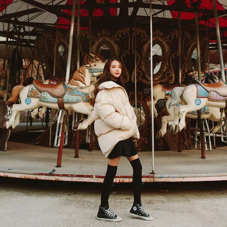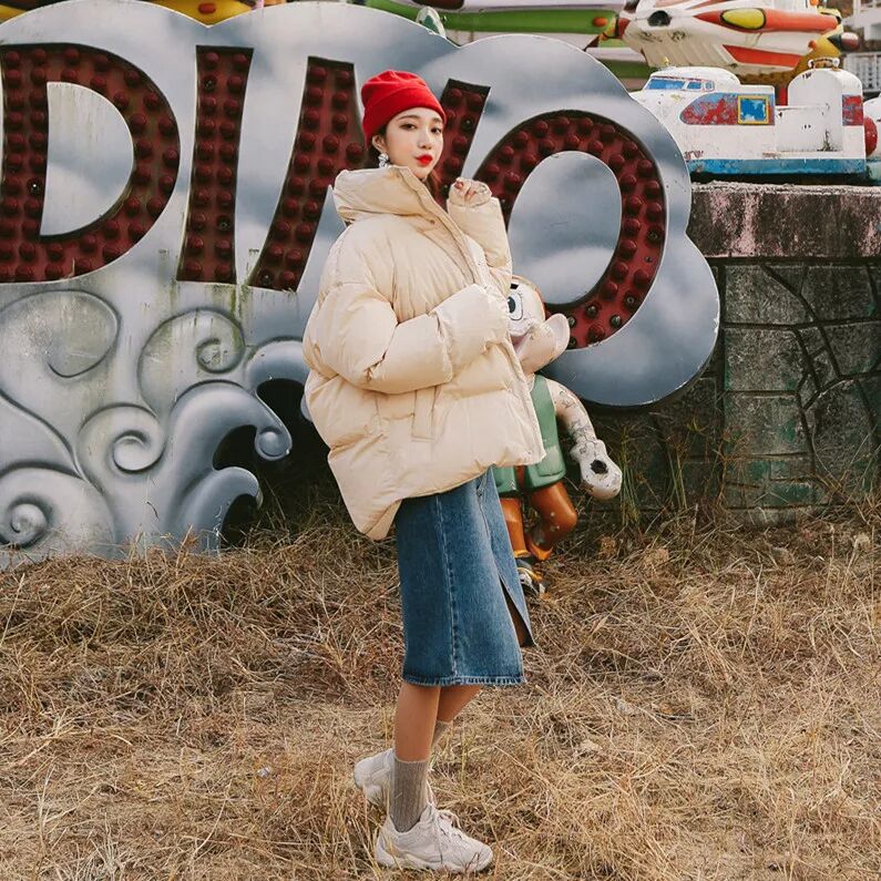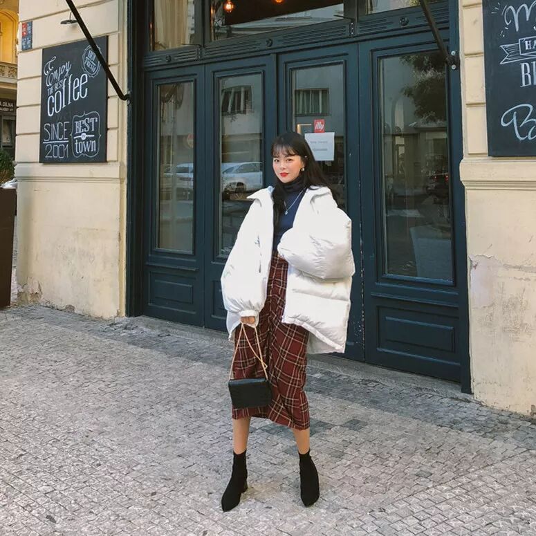 而冬季最难穿莫过于Oversize的羽绒服了,但穿不好像扛了件大棉被出门。Oversize的羽绒服也可以叫做面包服,英文名叫puff coat,只要搭配的好,韩范儿欧美范儿新手捏来。宝宝们可以露腿来穿,敞开羽绒服内搭黑色半身裙,不仅显瘦,还能注入些许小性感。