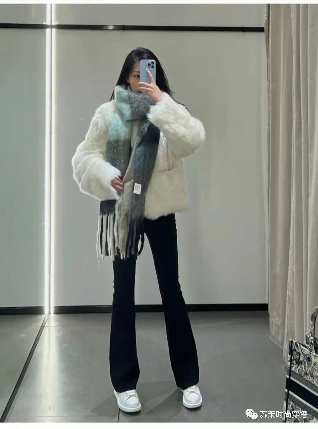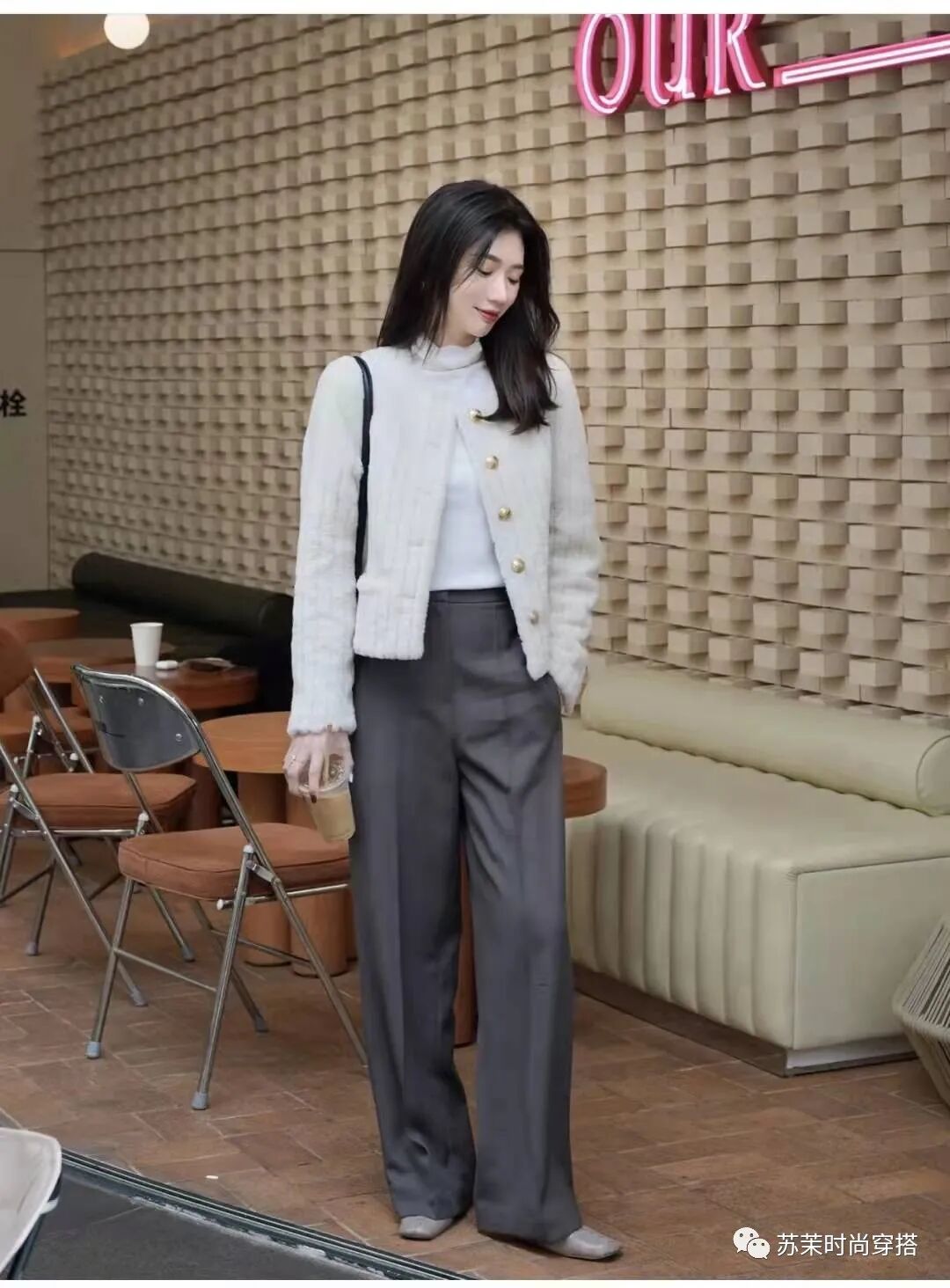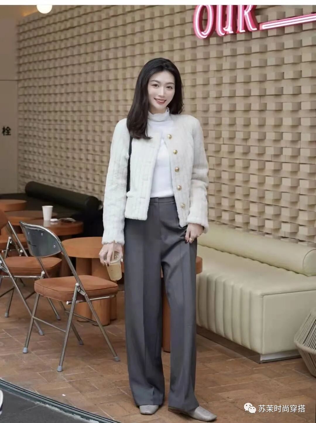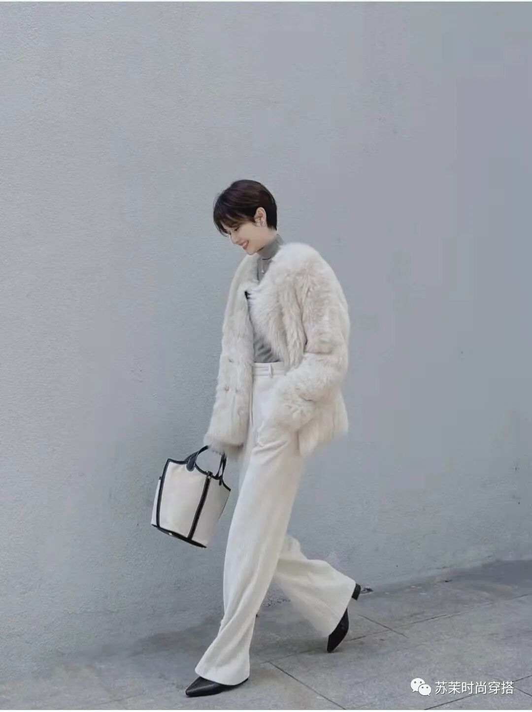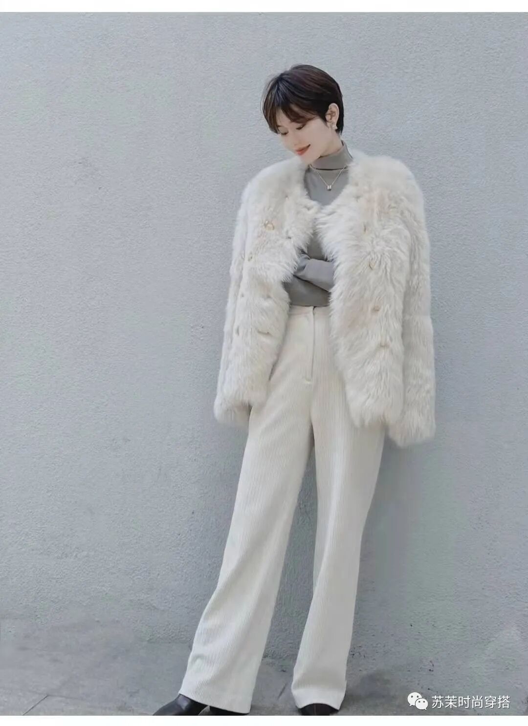 6、 奶白色羊羔毛皮草+内搭白色高领+灰色宽松西装裤+黑色皮鞋