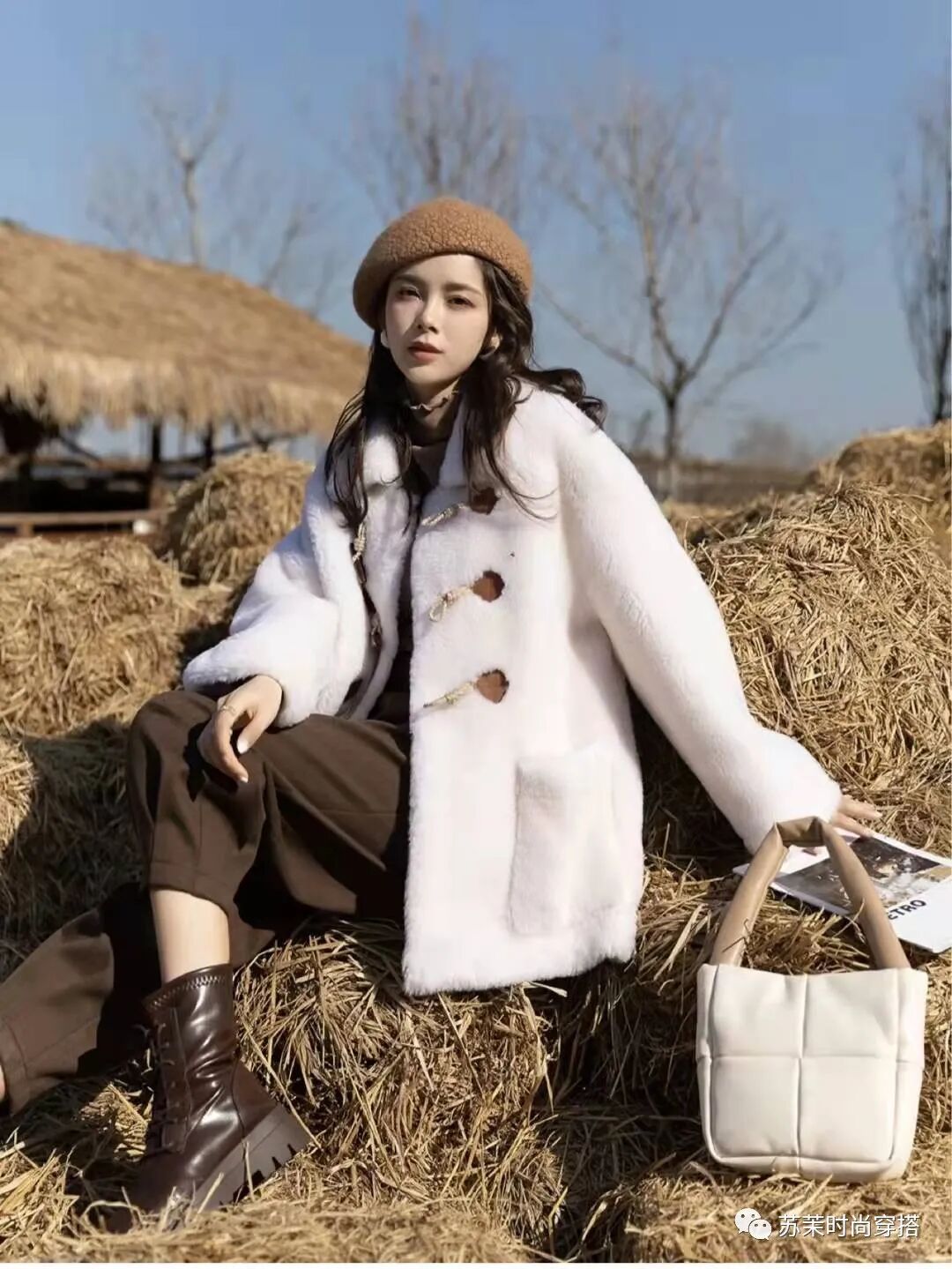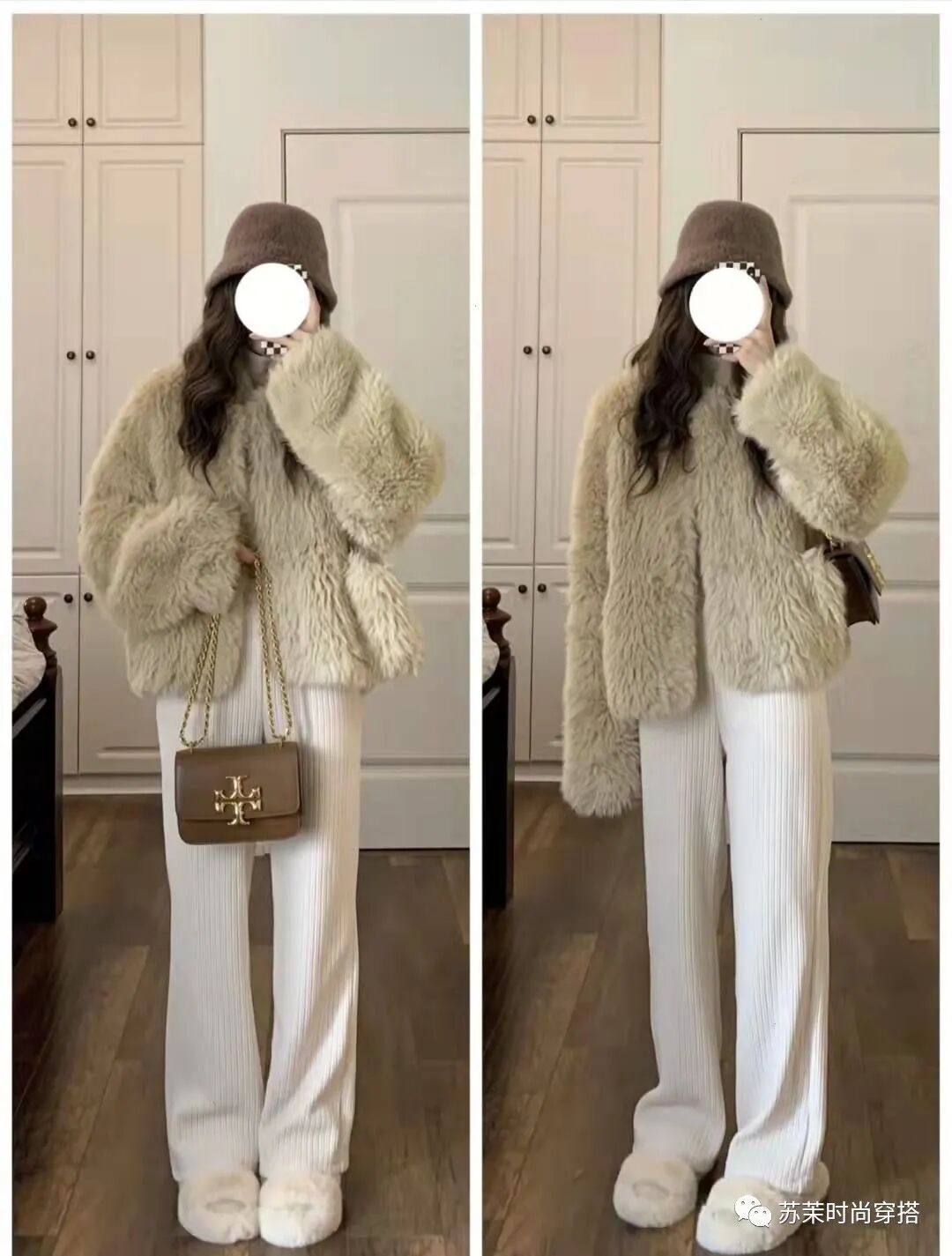 2、 奶油米色短款皮草+内搭米色高领+白色针织阔腿裤+毛毛鞋