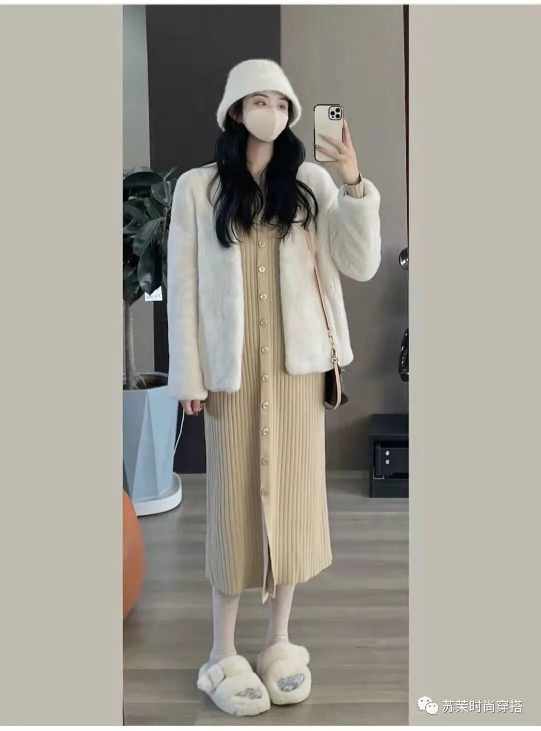 7、 珍珠白短款皮草+内搭奶茶色针织连衣裙+毛毛鞋
