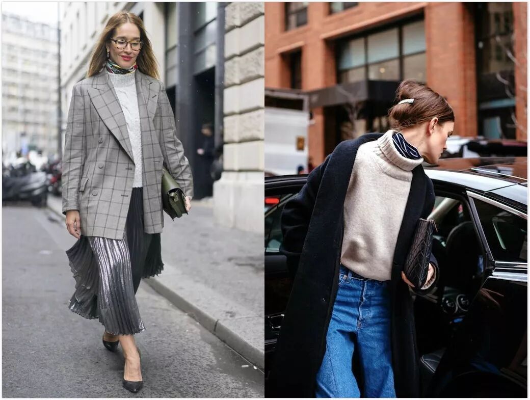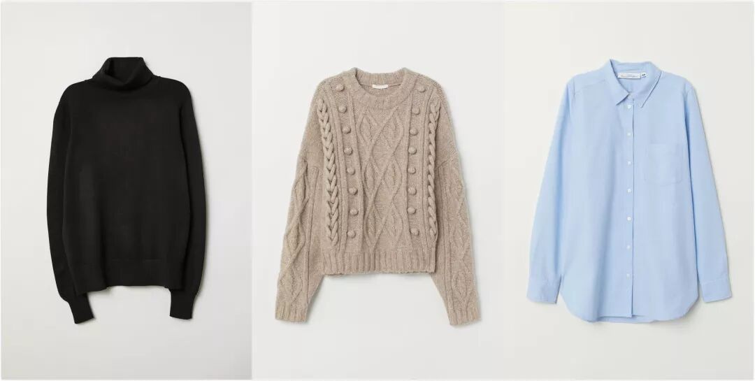 定番单品:必拥有贴身高领毛衣(黑色,裸色),棉质衬衣(淡蓝色,白色),粗针织毛衣。