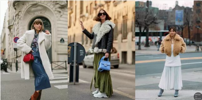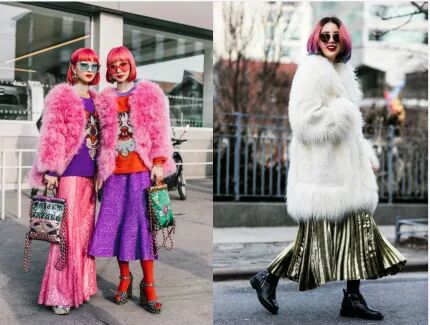 定番单品:飘逸的纱裙or 针织长裙(二选一),自己喜欢的阔腿裤,人造皮草外套(必备)