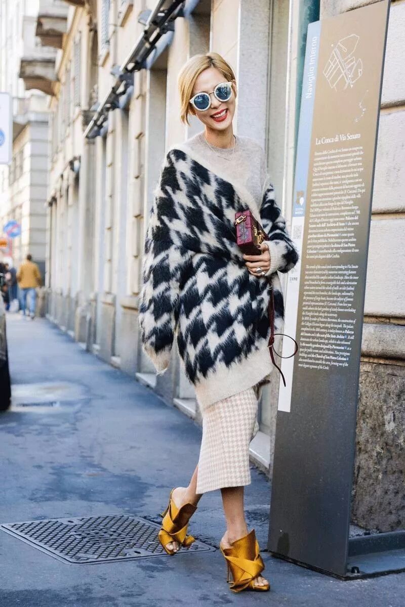 搭配墨镜,时髦典雅的气质简直不要太高级。需要遵循的一个原则就是把毛衣塞进下装,好比例就是这么穿出来的~▼