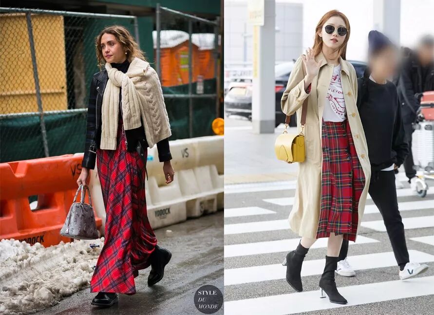 红色的苏格兰方格裙虽然很经典,但也很挑人穿。增添一款燕麦色单品的话,能很好的把“古老”气息压下去,整体更明快▼