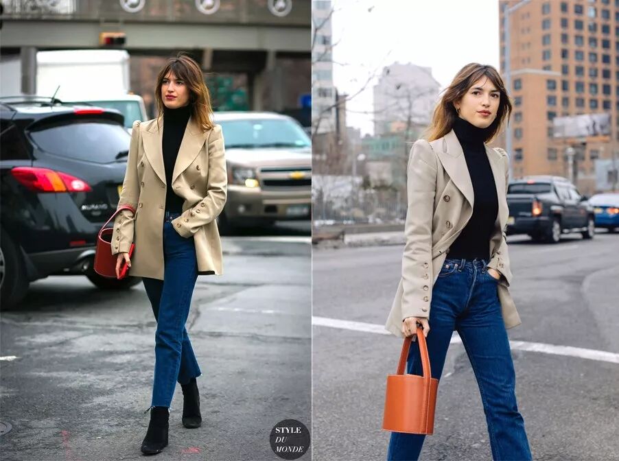 没有什么单品是牛仔hold不住的,牛仔裤搭燕麦色风衣的时髦福利适合任何人▼