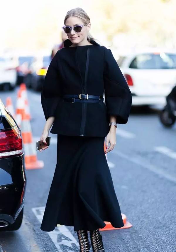 奥利维亚身穿黑色呢大衣裙套装,就用一根藏蓝色的细腰带系在了外套上,打造高腰线。