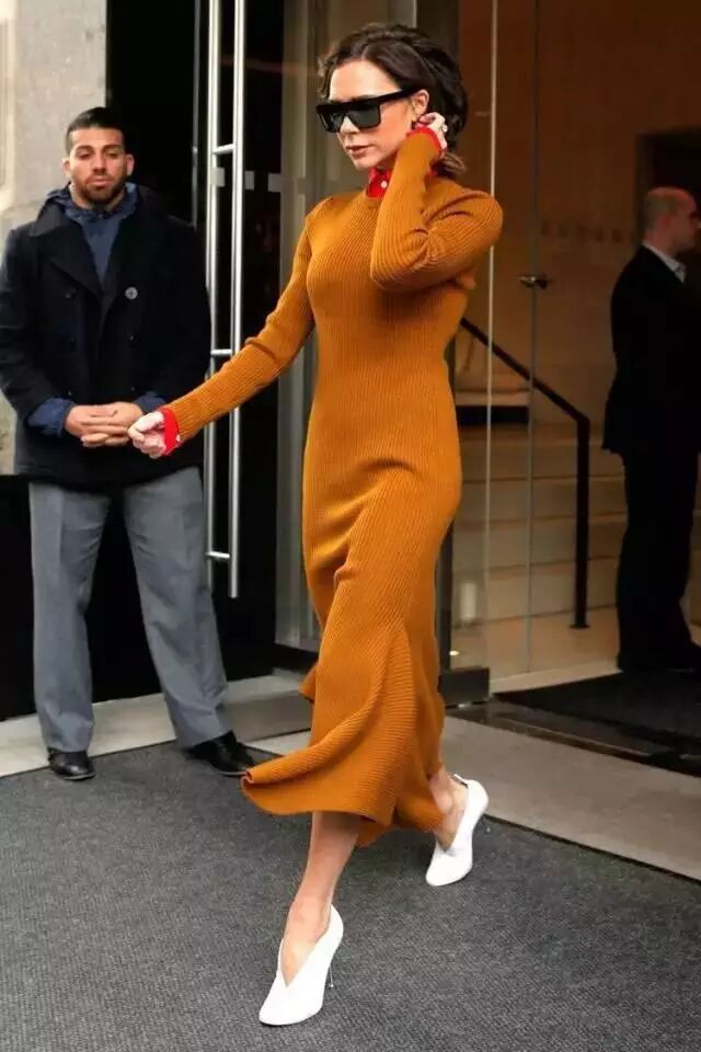 要么就让鞋子露出脚裸,像贝嫂这种V型的鞋面露出一半的脚面,使脚面与腿部有延伸感,更显腿长。