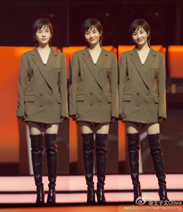 王子文身穿凸显腰线的修身西服外套,搭配高跟过膝靴,真是让胸部以下全是腿了!